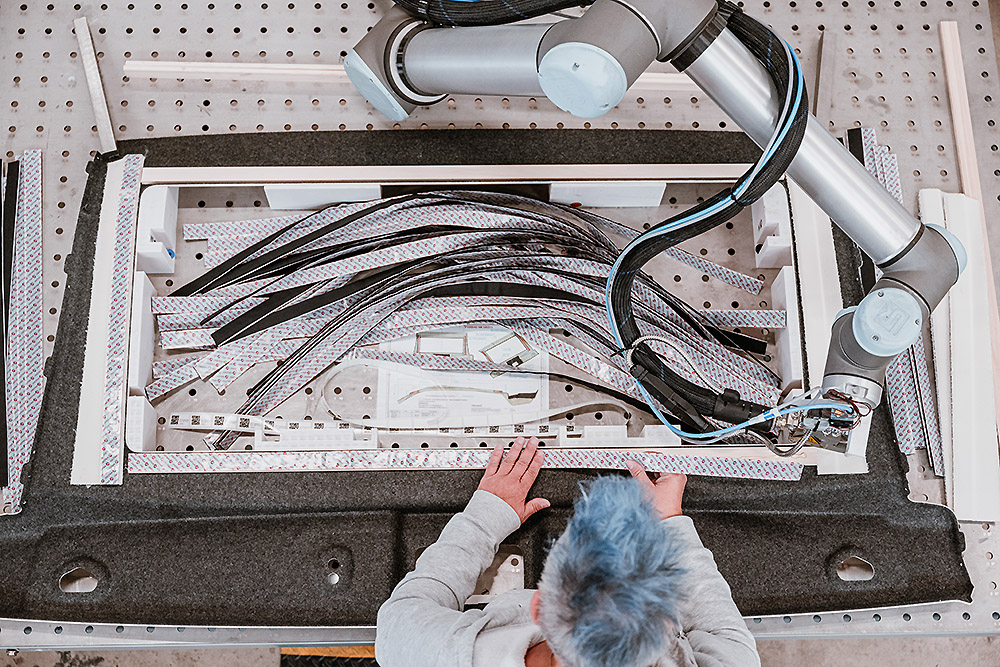 Thermogeformte Interieurteile übernehmen im Fahrzeug weit mehr als eine optische Funktion. Sie führen, stützen und verbinden Bauteile und müssen dafür exakt vorbereitet werden. Direkt nach dem Formprozess veredeln wir unsere Bauteile und bereiten sie optimal für die spätere Montage vor. Kollaborative Roboter tragen dabei präzise die benötigten Klebstoffbahnen auf. Das Aufbringen der Anbauteile erfolgt anschließend durch geschulte Mitarbeiter, die dank klarer Orientierungspunkte schnell und sicher arbeiten können. Eine besondere Stärke unseres Prozesses ist die dreidimensionale Laserprojektion. Diese Technik projiziert die exakten Positionen der Anbauelemente millimetergenau auf das geformte Bauteil. Das schafft maximale Übersicht, reduziert Fehlerquellen und sorgt für eine gleichbleibend hohe Passgenauigkeit. Ob Clips, Kunststoffleisten, textile Befestiger oder Verstärkungselemente: Wir integrieren alle Komponenten so, dass der anschließende Montageprozess beim Kunden einfach und effizient ablaufen kann.