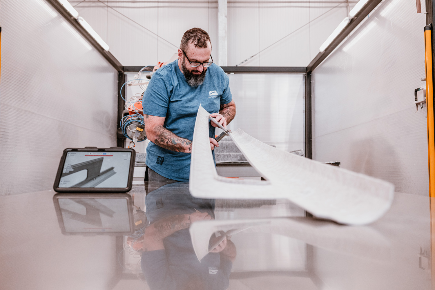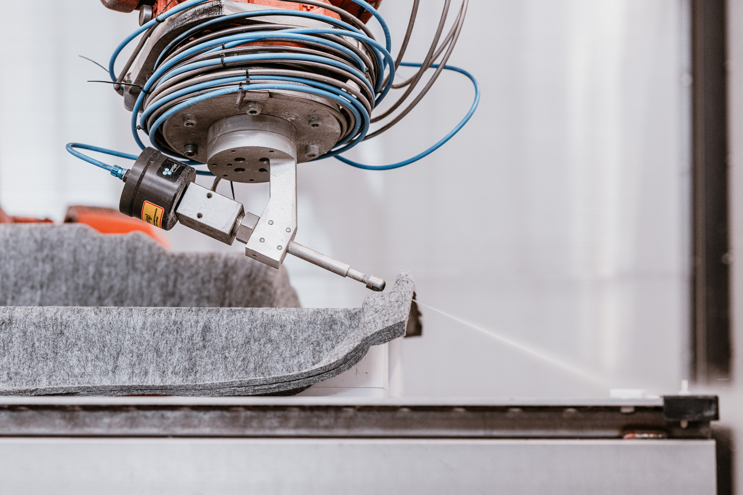 Eine der Möglichkeiten, unseren Composite-Formteilen die finale Form zu geben, ist, ihre Kanten mit einem Hochdruckwasserstrahl zu beschneiden. Das Verfahren ermöglicht extrem saubere und präzise Schnittkanten, die ohne Nachbearbeitung auskommen und das Material nicht thermisch belasten. Dank des sehr schmalen Schneidstrahls lassen sich selbst enge Radien und kleinste Winkel mühelos erreichen, was besonders bei komplexen Verkleidungsgeometrien entscheidend ist. Die Kombination aus hoher Geschwindigkeit, minimalem Werkzeugverschleiß und einer konstant hervorragenden Schnittqualität macht den Wasserstrahlbeschnitt zu einem universellen und effizienten Verfahren für nahezu alle Bauteile, die wir fertigen.